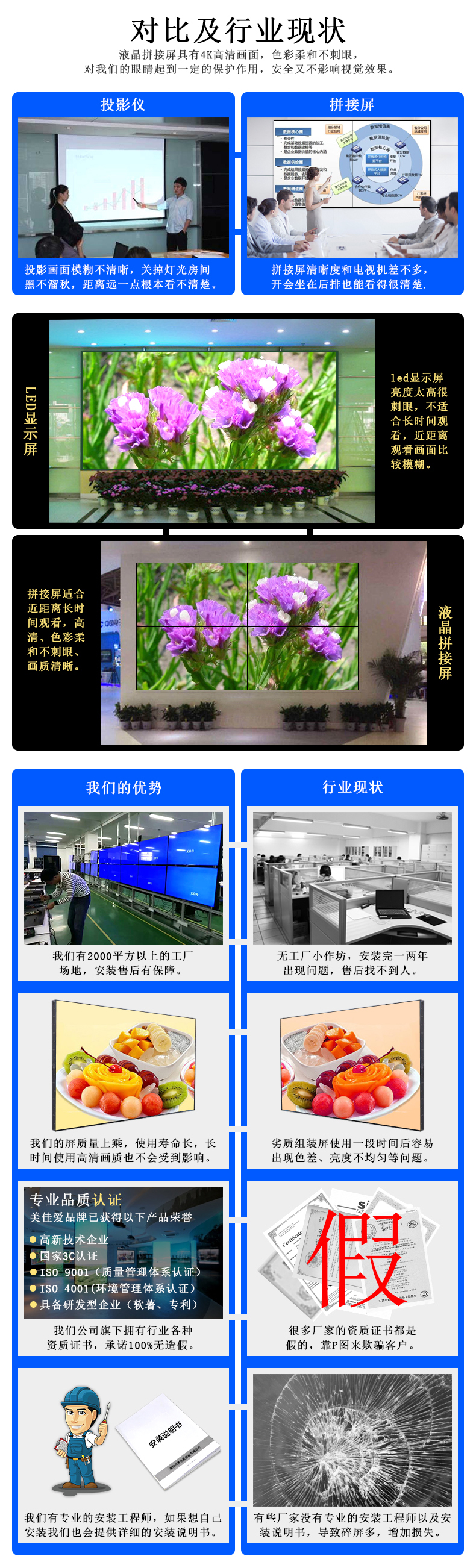 【美佳愛-4k液晶拼接屏生產廠家電話400-997-9971】LG43寸液晶拼接屏-拼縫8mm產品通過ISO9001_3C_節(jié)能認證等30多項認證,主營LG/京東方/三星大屏幕電視墻,其尺寸有32寸40寸43寸46寸49寸55寸65寸75寸液晶拼接單元,也有曲面,弧形,柔性,無縫LED顯示屏,顯示器,超窄邊高清監(jiān)視器,提供企業(yè)展廳展示,KTV,酒吧,會議室,視頻監(jiān)控系統(tǒng)解決方案設計-報價-安裝施工-售后超窄邊維修等服務