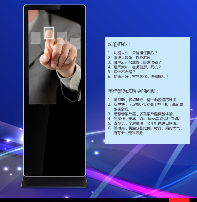 【深圳市美佳愛-65寸紅外觸摸一體機(電腦/立式)生產(chǎn)廠家電話400-997-9971】通過ISO9001_3C認證,主營多點紅外/電容式觸摸屏一體機,觸控查詢一體機,其他尺寸18.5寸21寸24寸27寸32寸40寸43寸46寸49寸55寸65寸75寸86寸98寸100寸多功能多媒體教學會議一體機,戶外立式/壁掛雙面廣告機,單機版/安卓網(wǎng)絡廣告機 豎屏樓宇電梯廣告機,長條型屏,工業(yè)級工控電腦觸摸顯示器,大尺寸觸摸屏查詢系統(tǒng),商顯平板電腦電視,提供報價價格,安裝施工,售后維修等