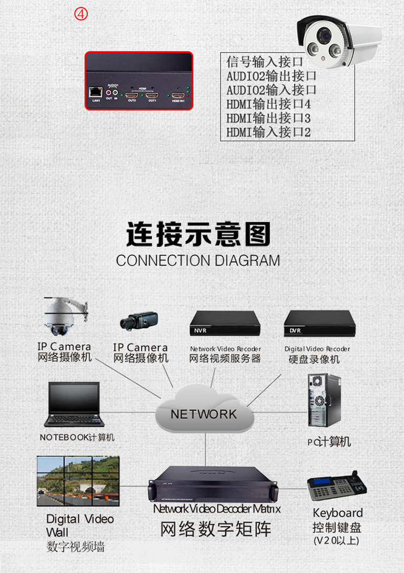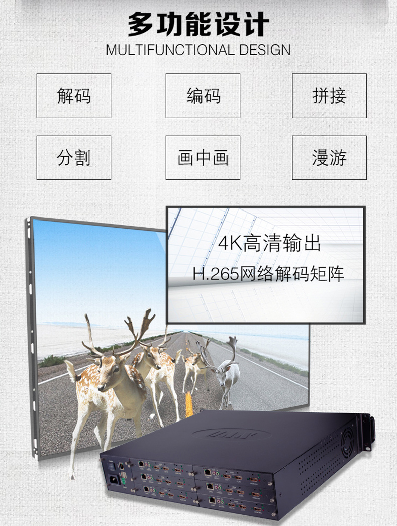 網(wǎng)絡數(shù)字解碼矩陣切換器采用最新的安防專用編解碼芯片,專為H.265標準及4K超高清編解碼而設計,產(chǎn)品采用嵌入式LINUX架構,保障系統(tǒng)的穩(wěn)定運行,采用模塊化設計,可以在大型、超大型數(shù)字安防監(jiān)控系統(tǒng)中實現(xiàn)解碼、編碼、拼接、分割、畫中畫、漫游等功能,為工程項目最大程序解決大數(shù)據(jù)數(shù)字化監(jiān)控系統(tǒng)提供解碼上墻及多信號輸入編碼等提供一站式解決方案;設備采用全鋁標準機箱,結構上大氣美觀可靠,散熱性結構化好。