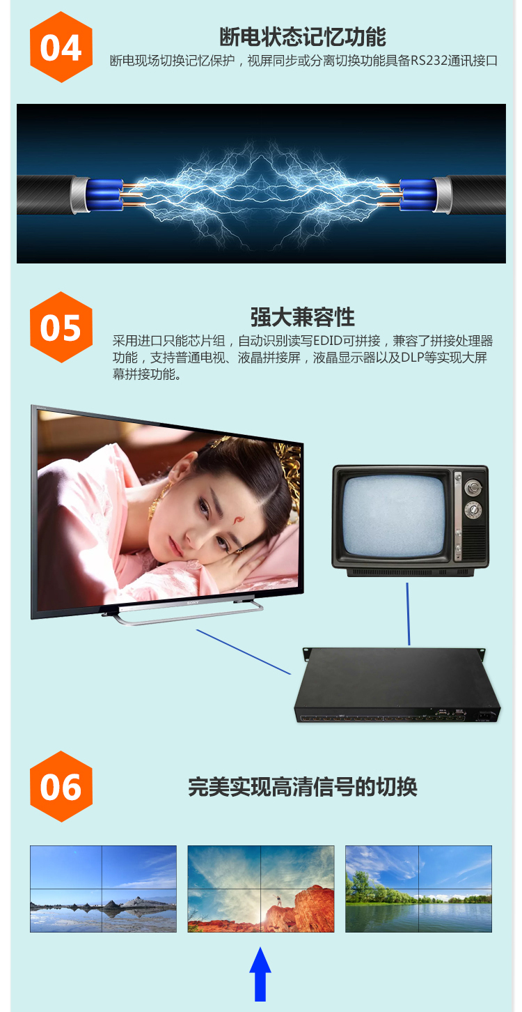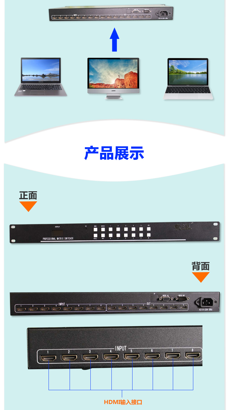 -HDMI高清全數(shù)字矩陣切換器, 所有端口支持藍光DVD(支持HDCP);輸入輸出自動均衡,輸入加輸出傳輸距離大于40米(不需配帶芯片的HDMI線);鋁拉絲面板,帶藍光液晶顯示屏顯示操作狀態(tài);帶串口控制,可選配網(wǎng)口;所有輸入端口支持現(xiàn)場寫EDID,所有輸出端口可讀回EDID。