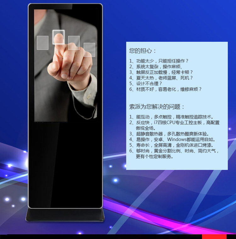 【深圳市美佳愛-液晶廣告機,觸摸一體機生產(chǎn)廠家電話400-997-9971】立式觸摸一體機產(chǎn)品通過ISO9001_3C認(rèn)證,主營多點紅外/電容式觸摸屏一體機,觸控查詢一體機,其他尺寸18.5寸21寸24寸27寸32寸40寸43寸46寸49寸55寸65寸75寸86寸98寸100寸多功能多媒體教學(xué)會議一體機,戶外立式/壁掛雙面廣告機,單機版/安卓網(wǎng)絡(luò)廣告機 豎屏樓宇電梯廣告機,長條型屏,工業(yè)級工控電腦觸摸顯示器,大尺寸觸摸屏查詢系統(tǒng),商顯平板電腦電視,提供報價價格,安裝施工,售后維修等